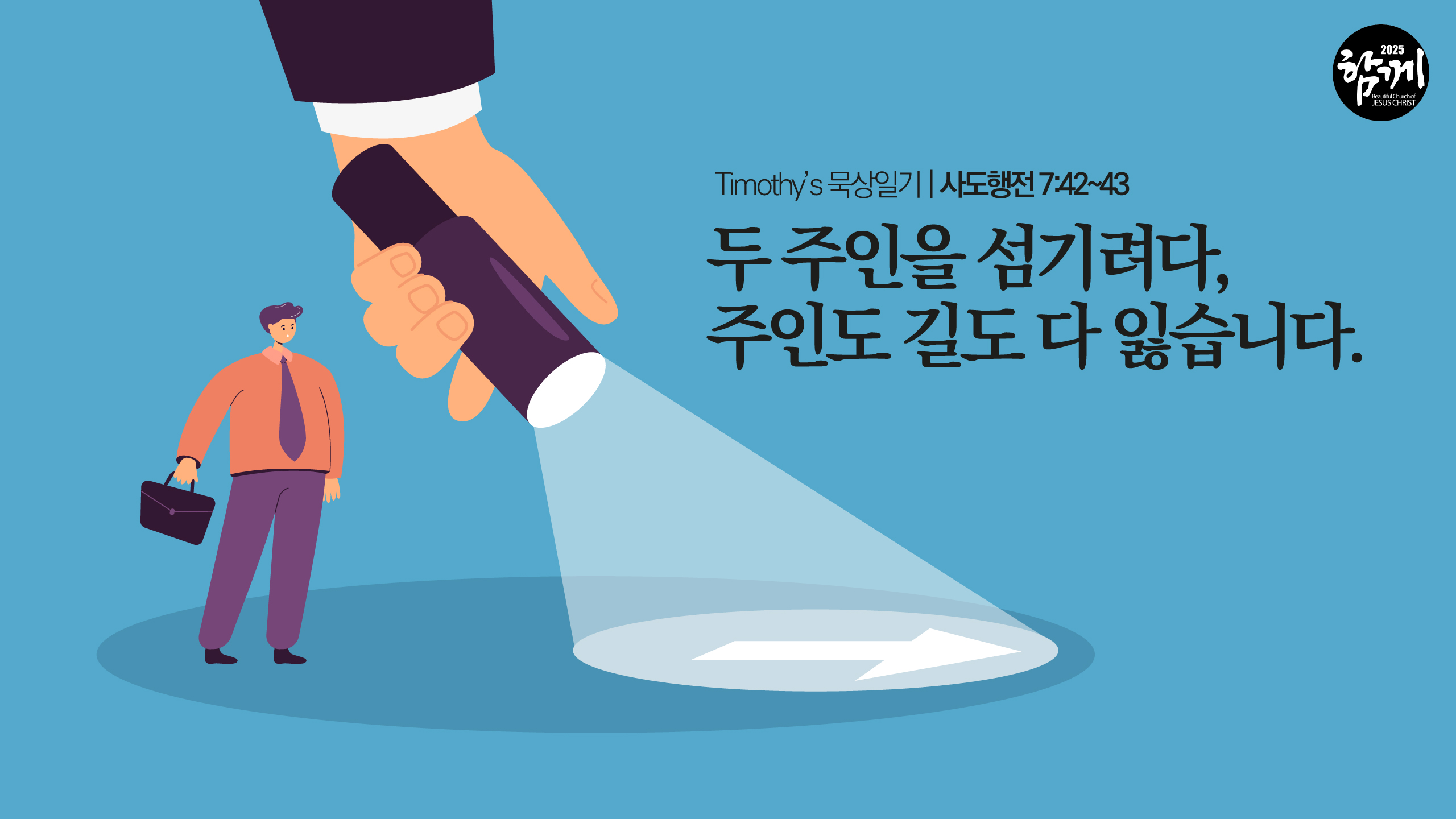 두 주인을 섬기려다, 주인도 길도 다 잃습니다. 오늘 하루는 오직 한 분, 예수 그리스도만을 바라보는 믿음의 걸음이 되길 소망합니다. 그분이 우리의 불안을 잠재우고, 길을 밝히시며, 주인 되시기 때문입니다.