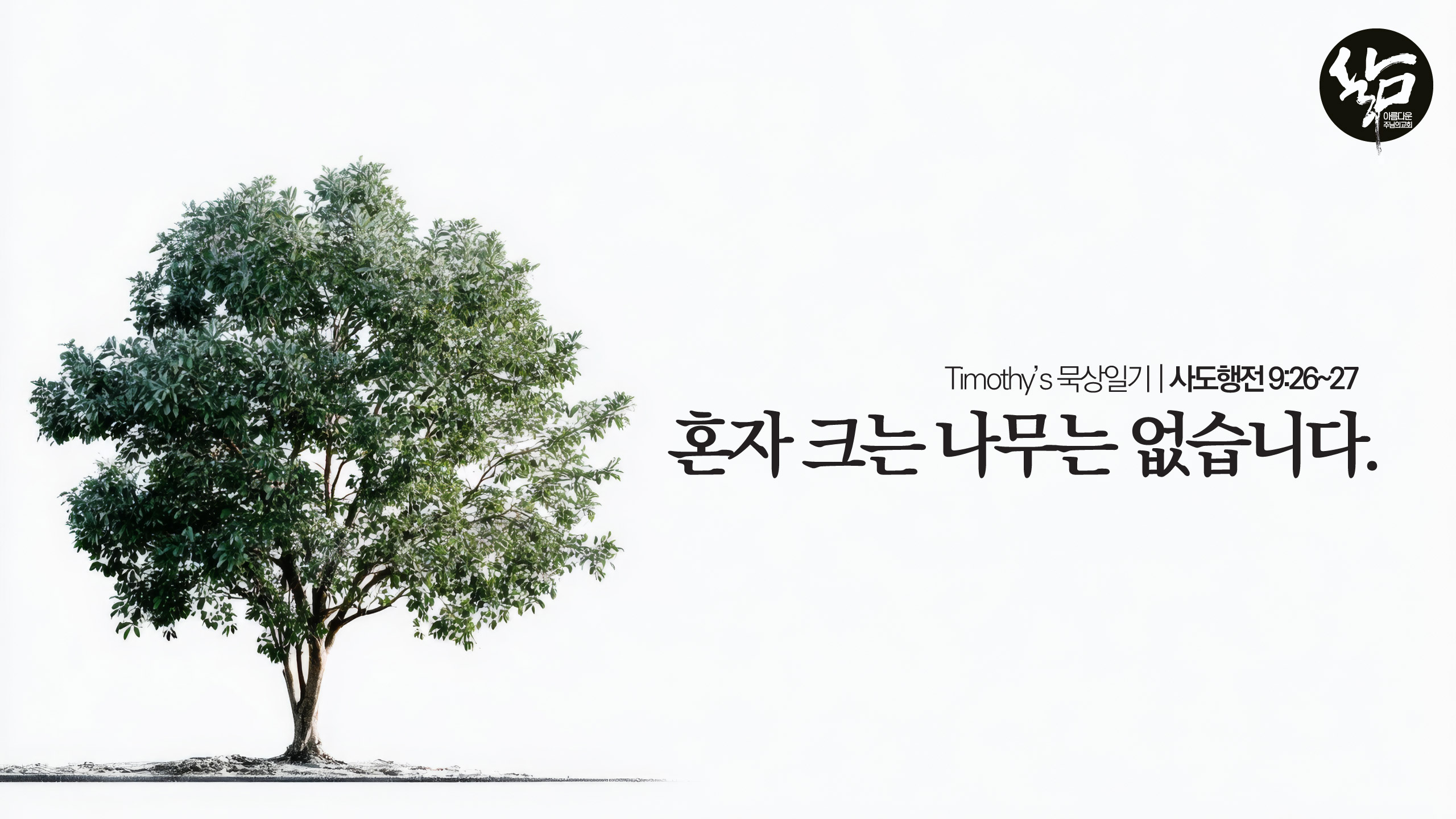 혼자 크는 나무는 없습니다. 아무리 씨앗이 좋아도 비바람을 막아줄 숲이 없으면 거목으로 자랄 수 없습니다. 교회는 서로를 세워주고, 때로는 실수해도 기다려주는 곳입니다. 서로가 서로에게 바나바가 되어 믿어주고 보증해 주는 곳이죠.